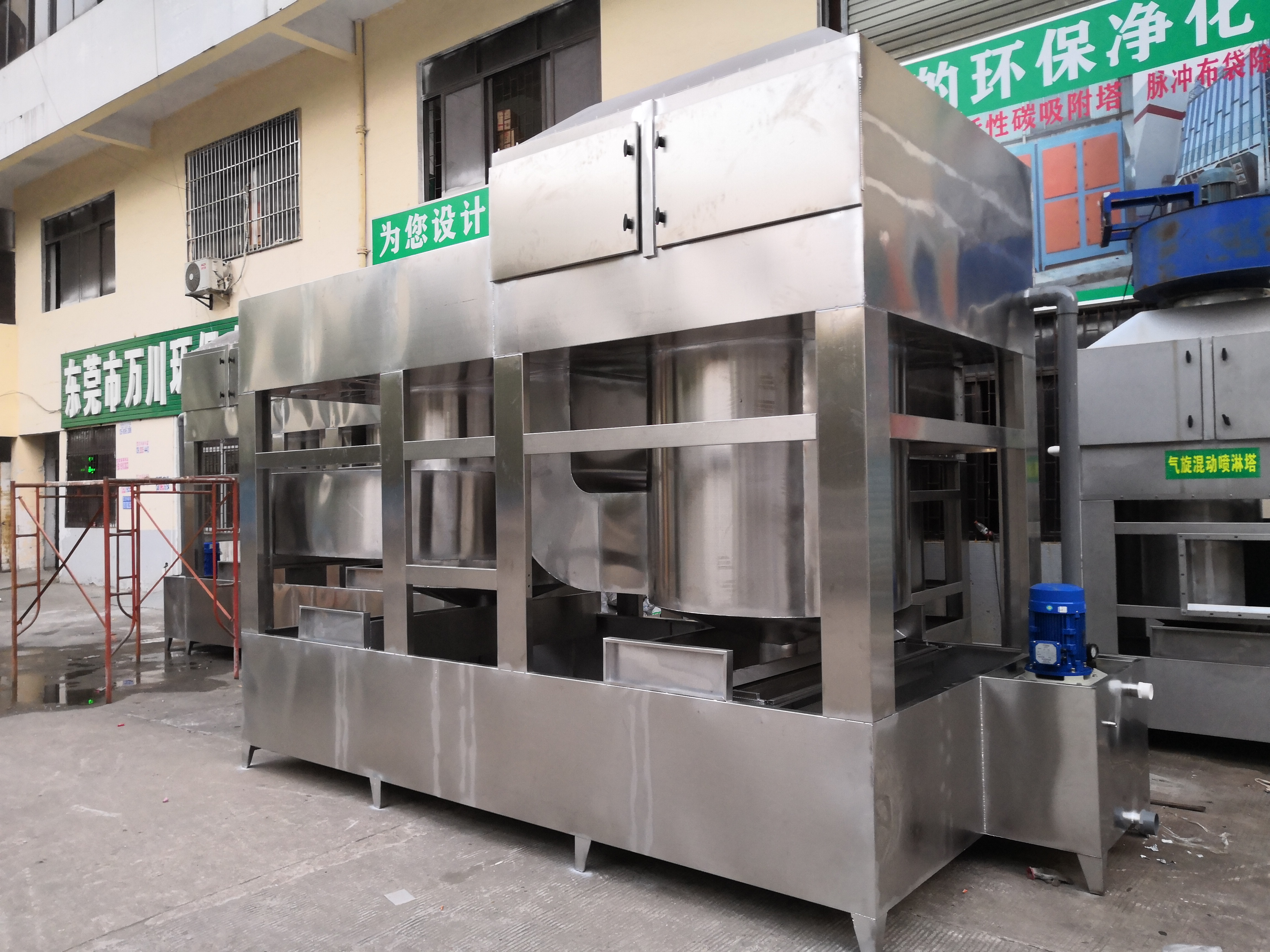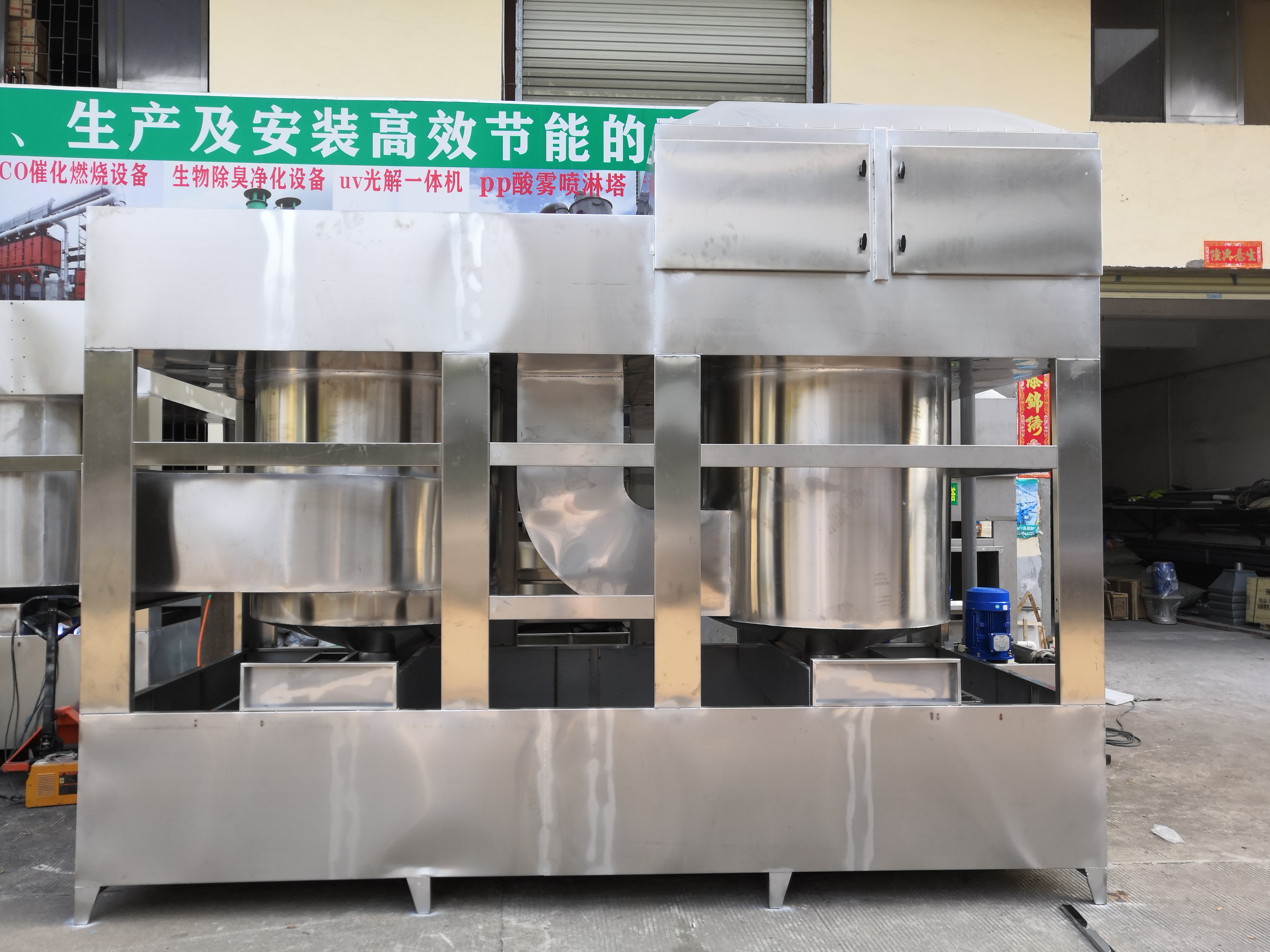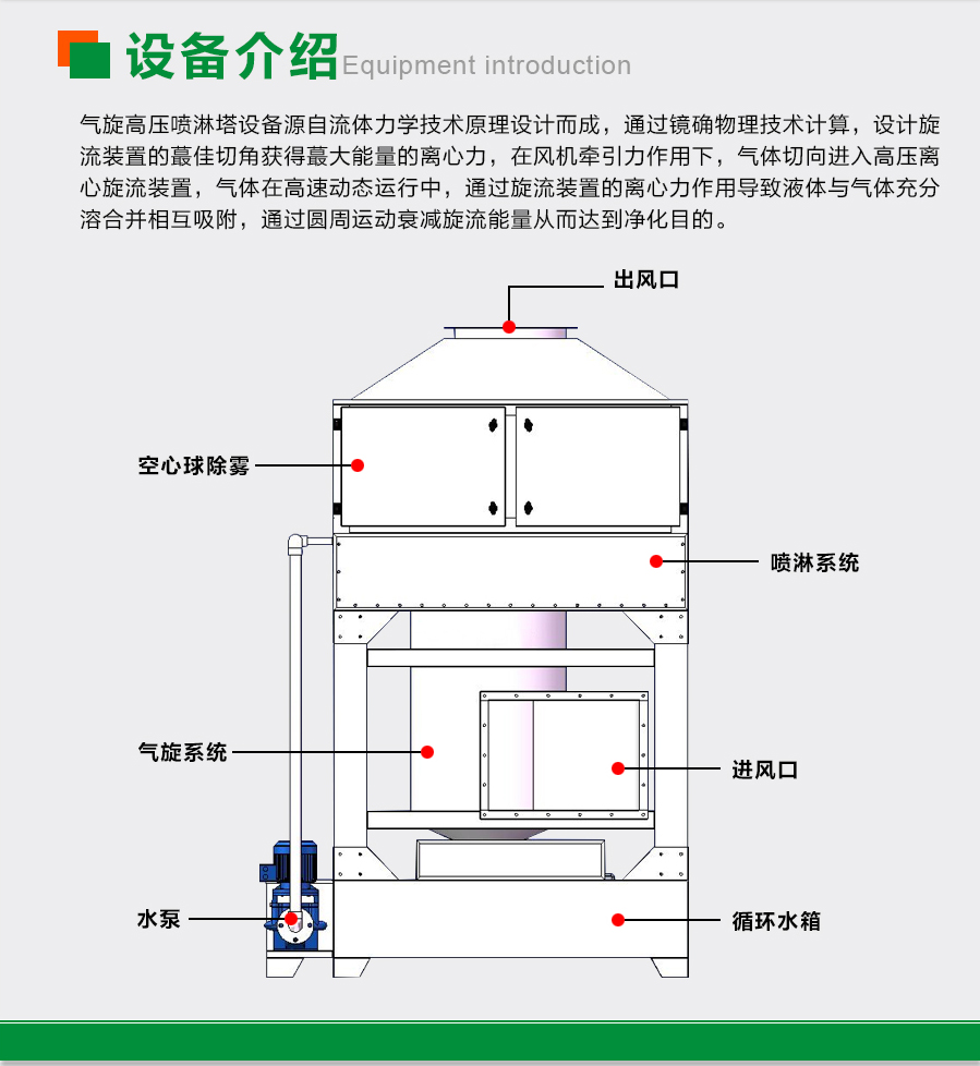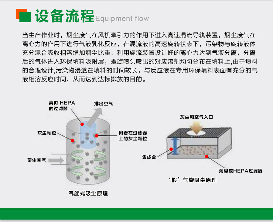 含塵含味氣體通過吸氣罩收集,在風機的作用下,經(jīng)過管道輸送負壓進入雙級氣旋噴淋塔。氣旋混流裝置快速運轉,多級連續(xù)的凈化使得含塵含味氣體與水霧充份混合,在離心的作用下達到氣液分離。氣旋桶內部采用水泵循環(huán)給水,水在水箱經(jīng)水泵增壓后自螺旋噴嘴霧化而出,最后回流至水箱循環(huán)使用。分離出來的雜物下沉到水箱底部,經(jīng)凈化后的氣體進入填料隔水層,然后由風機排出。
