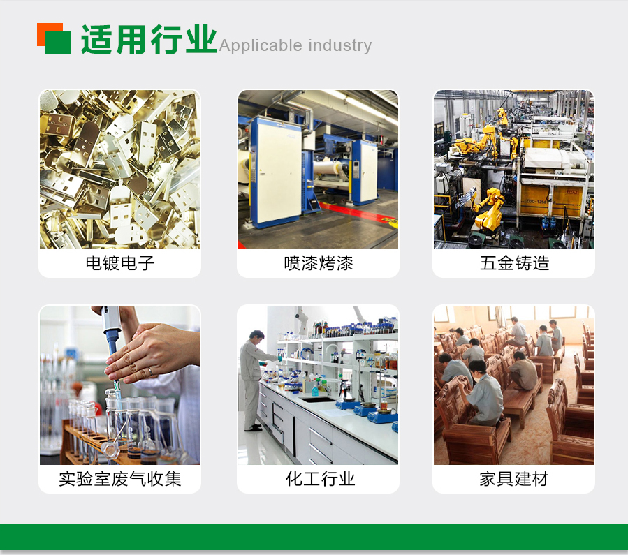 五金、噴漆、切割、半導體、冶金等行業(yè)生產過程中產生的含塵含味氣體,特別適合粉塵、廢氣等濃度大、溫度大、濕度大、易燃、易爆等工況。