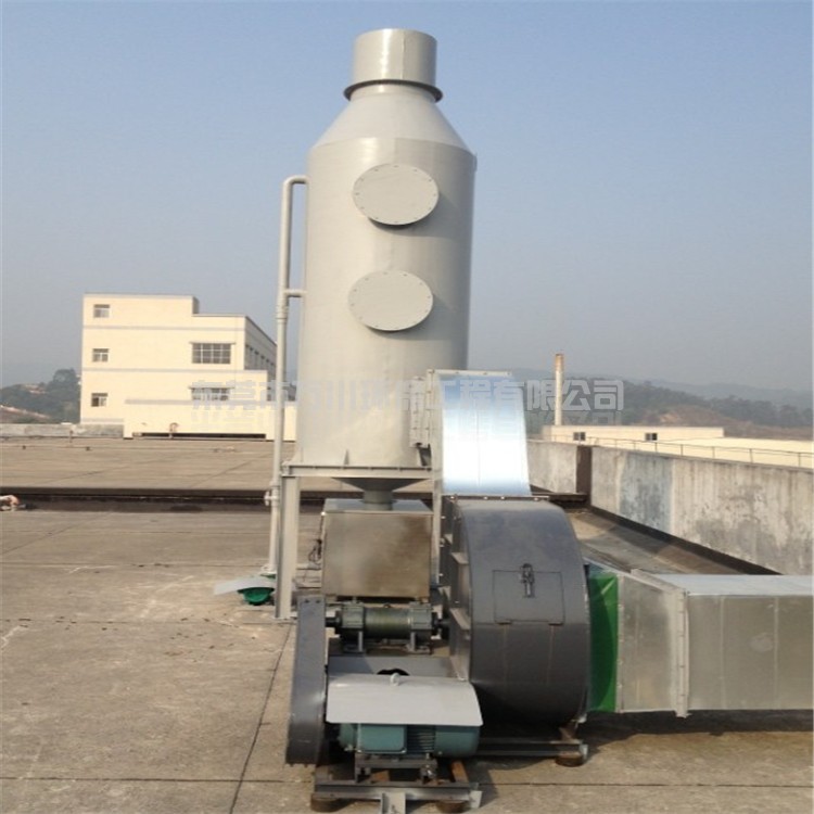 含塵廢氣在風(fēng)機(jī)的作用下,含塵氣體從塔體下方進(jìn)氣口沿切向進(jìn)入濕式除塵器噴淋塔,在風(fēng)機(jī)的作用下,迅速充滿(mǎn)進(jìn)氣段空間,然后塔頂位置的噴淋頭向下噴水,水與含塵廢氣接觸,使得空氣和粉塵分離,達(dá)到除塵的效果。濕式除塵器噴淋塔具有結(jié)構(gòu)簡(jiǎn)單、造價(jià)低、占地面積小、凈化效率高等優(yōu)點(diǎn),能夠處理高溫、高濕的氣流,將著火、爆炸的可能減至最低。